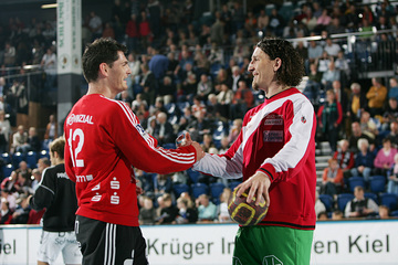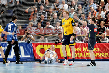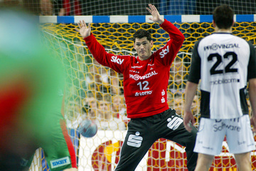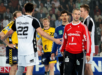 | Aufregung. | Spielszene. | Oliver Roggisch und Henning Fritz. | Dominik Klein gegen Henning Fritz. | |||