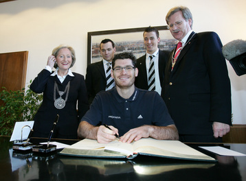 | Henning Fritz. | WM 2007: Empfang im Kieler Rathaus: Unsere Weltmeister. | WM 2007: Empfang im Kieler Rathaus: Unsere Weltmeister. | WM 2007: Empfang im Kieler Rathaus: Eintrag ins goldene Buch. | |||
