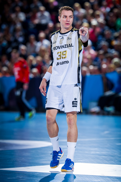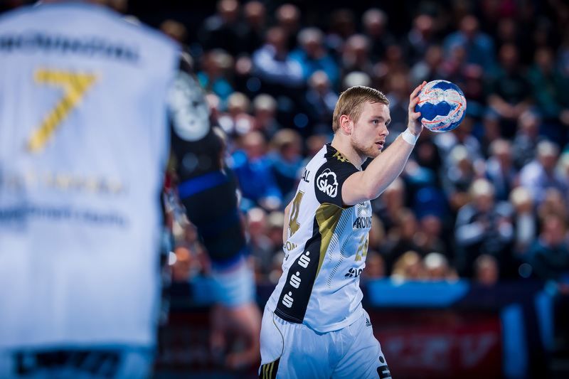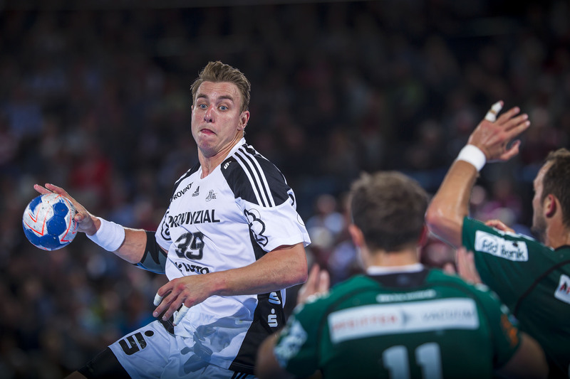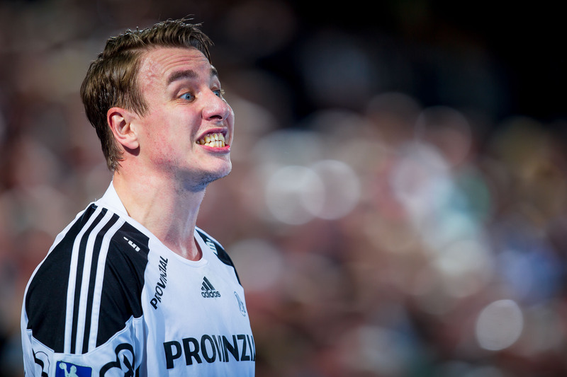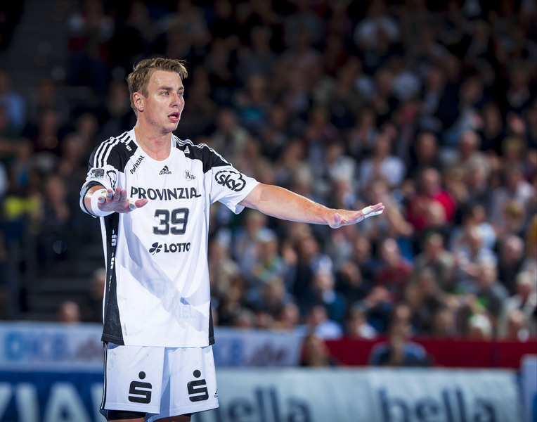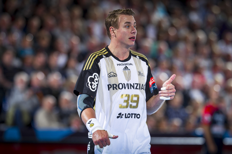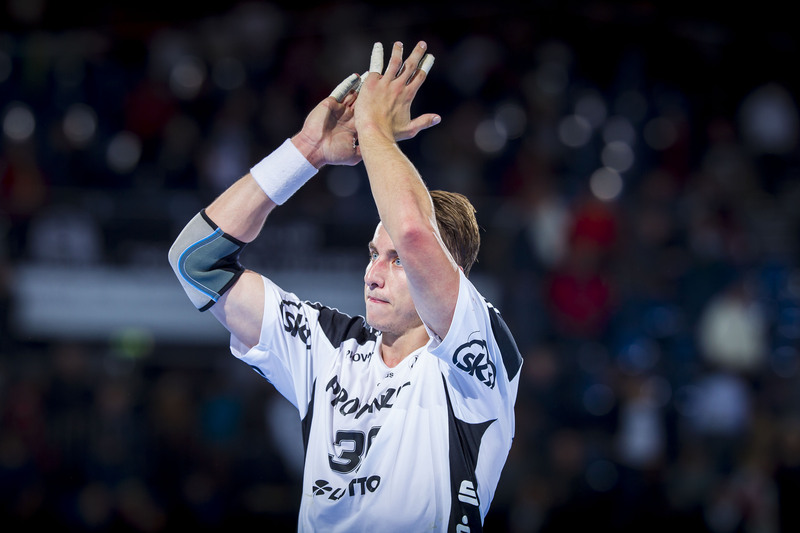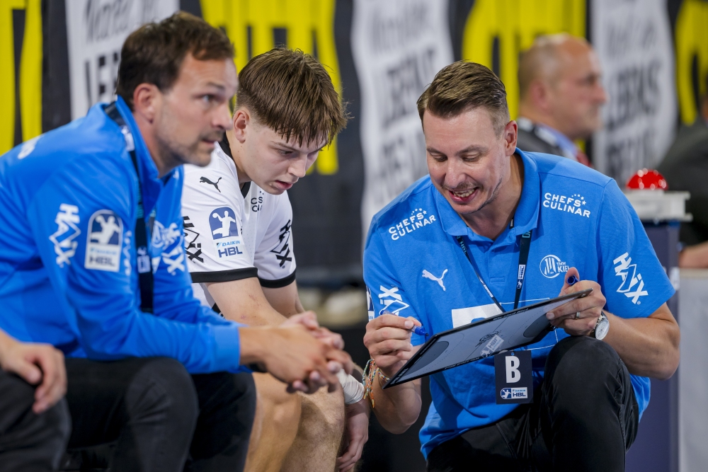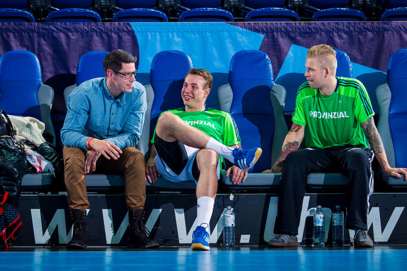 Die Bank. Pokalsieger! Christian Sprenger und Filip Jicha. Pokalsieger! Julian Poltrock behandelt Magnus Landin Jacobsen.