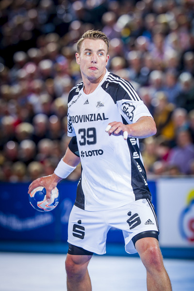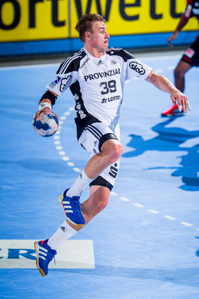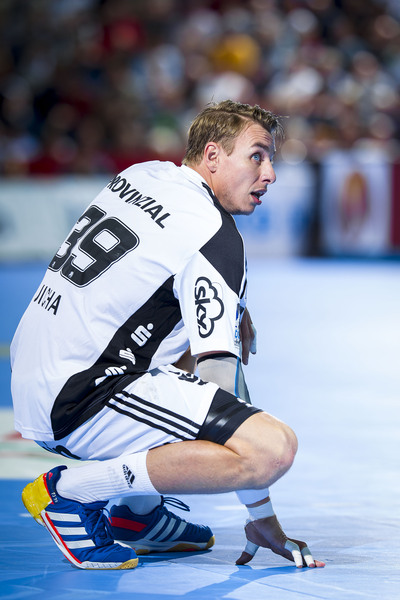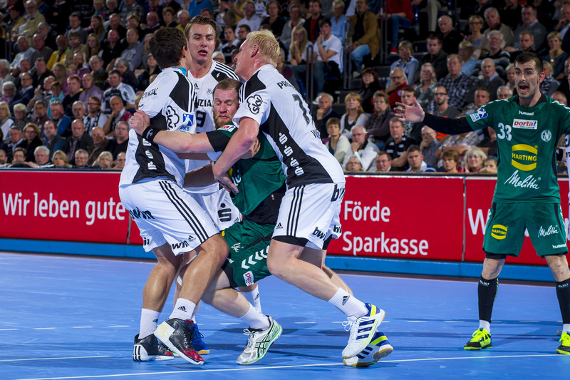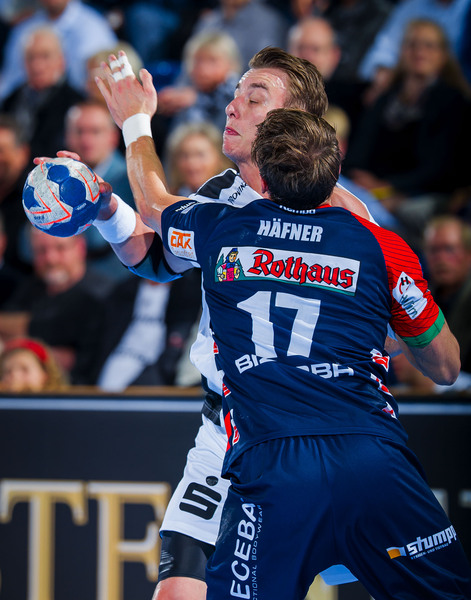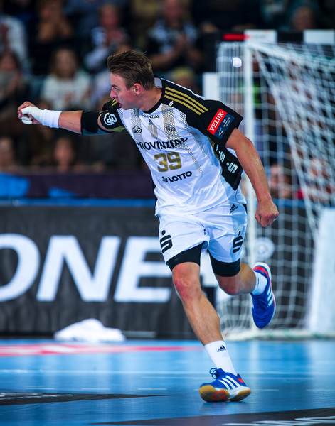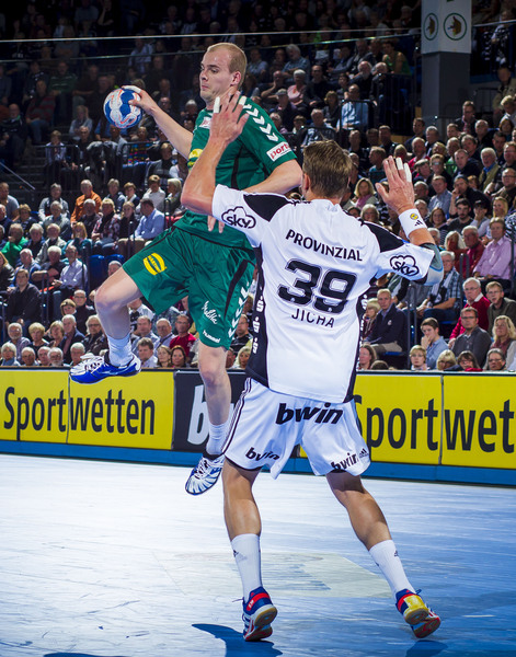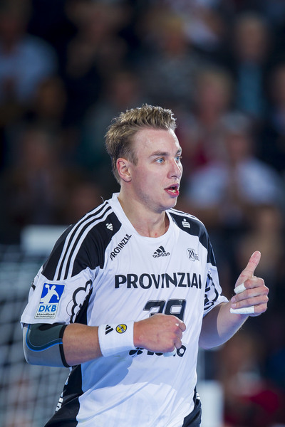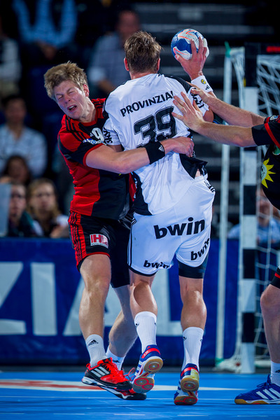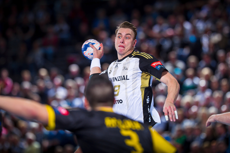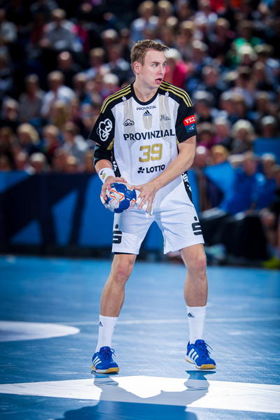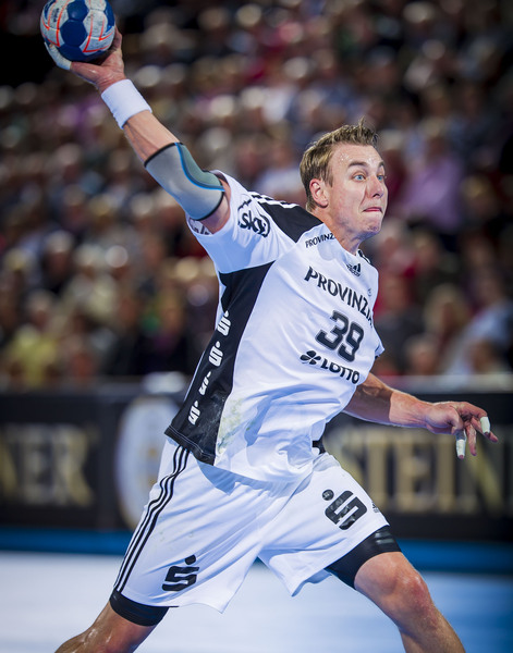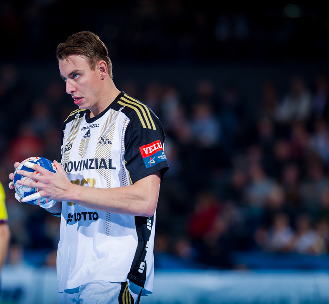 Die Bank. Pokalsieger! Christian Sprenger und Filip Jicha. Pokalsieger! Julian Poltrock behandelt Magnus Landin Jacobsen.