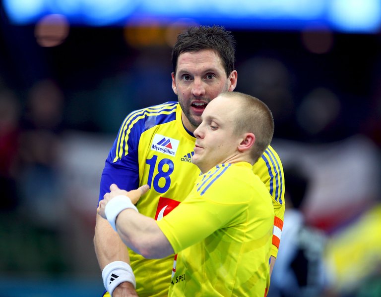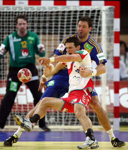 | Tobias Karlsson und Marcus Ahlm. | Spielszene. | Kampf um den Ball. | Aron Palmarsson gegen Tobias Karlsson. | |||