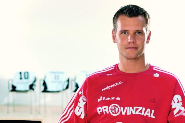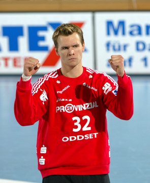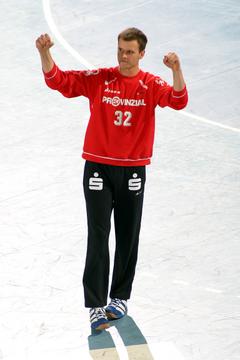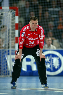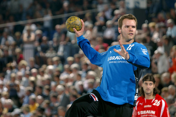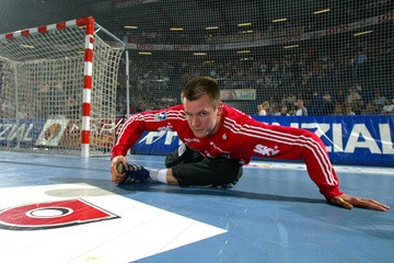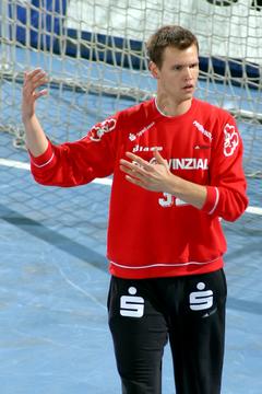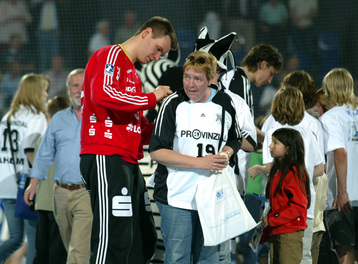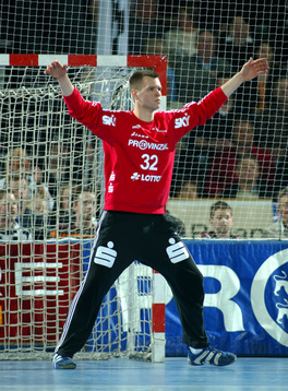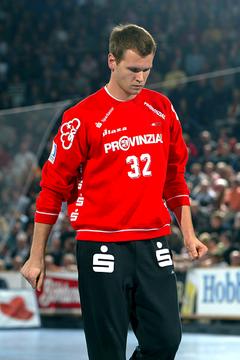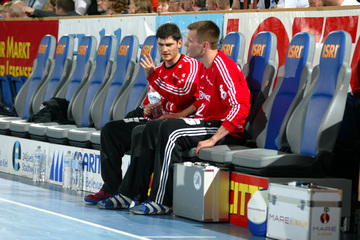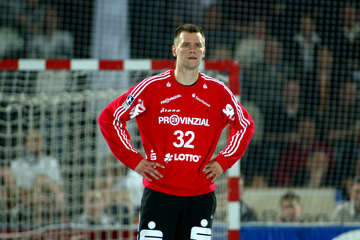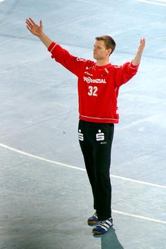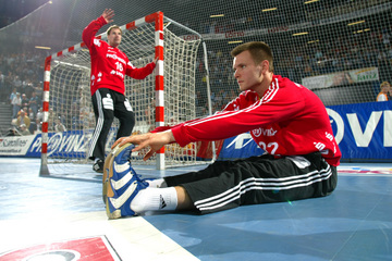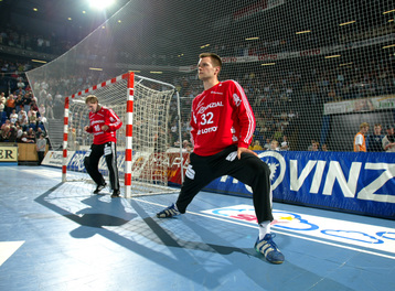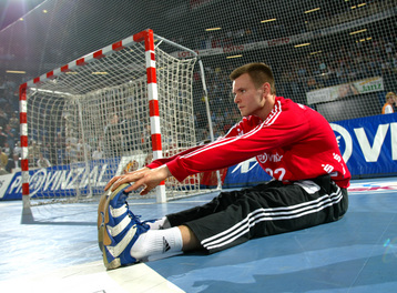 Kiels dritter Torwart Dennis Klockmann dehnt sich während der Halbzeitpause. Kiels dritter Torwart Dennis Klockmann dehnt sich während der Halbzeitpause. Tipps vom Welthandballer des Jahres 2004: Henning Fritz nutzt die Halbzeitpause, um sich mit seinem Ersatz-Torwart Dennis Klockmann zu unterhalten. Dennis Klockmann schreibt Autogramme.