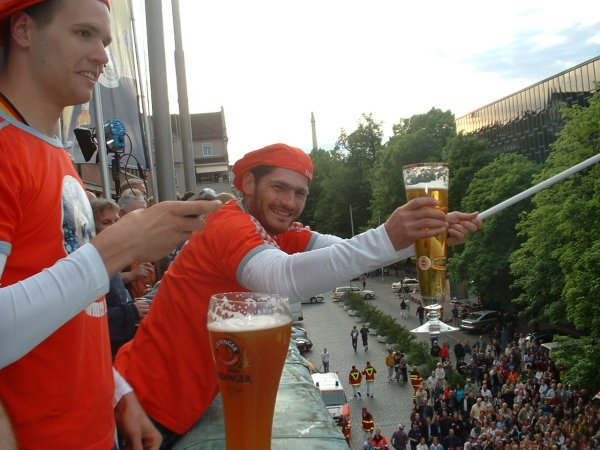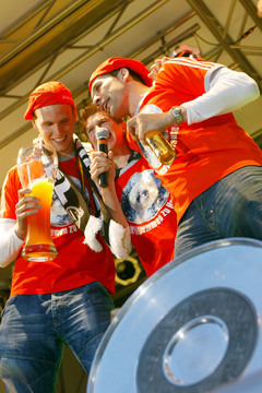 Meisterfeier auf dem Kieler Rathausplatz und wilde Gesangseinlagen. Von Links: Dennis Klockmann, Daniel Sommerfeld und Stefan Lövgren. Prost! Debütant Dennis Klockmann. Die Debütanten.
