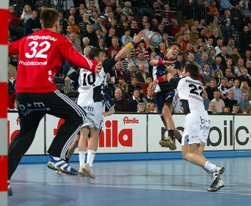 Dennis Klockmann. Dennis Klockmann. Karabatic attackiert Solberg, vorn Klockmann. Dennis Klockmann.