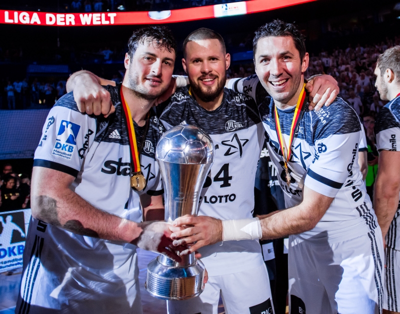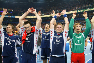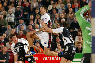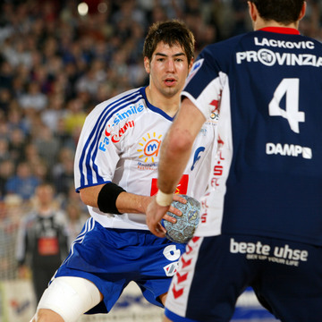2. Halbfinale: Flensburg gegen Nordhorn: Flensburgs Blazenko Lackovic wird von Holger Glandorf gestoppt. Rechts klammert Iwan Ursic Flensburgs Kreisläufer Johnny Jensen. 2. Halbfinale: Flensburger Jubel nach dem Schlussspfiff. Von links: Lars Christiansen, Andrej Klimovets, Blazenko Lackovic, Joachim Boldsen und Dan Beutler. Montpelliers Nikola Karabatic am Ball. Im Vordergrund Blazenko Lackovic. Blazenko Lackovic.