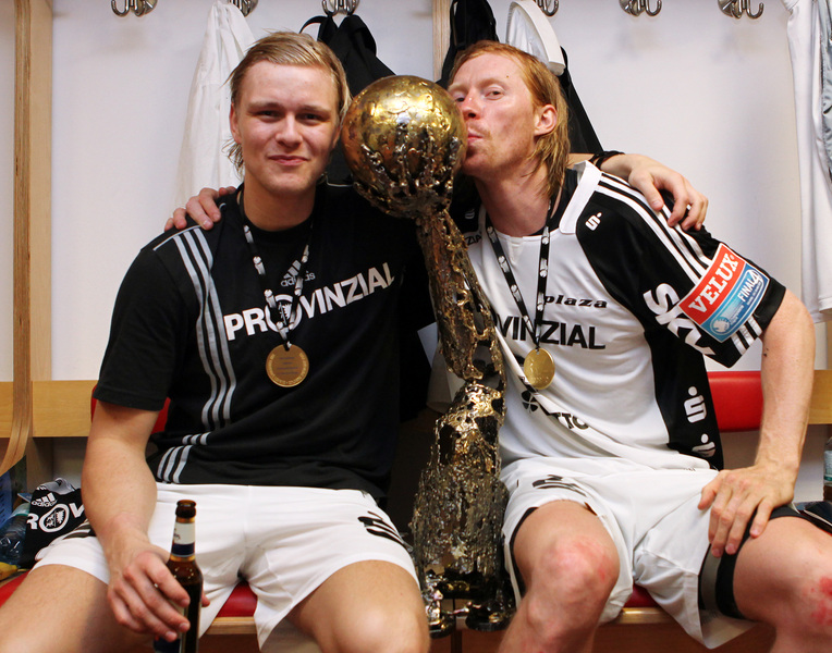 Börge Lund gegen Frank Löke. Verteidigung. Kampf um den Ball. Verteidigung.