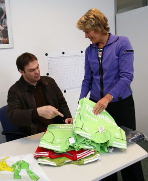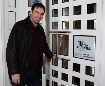 | Bruno Martini vor der THW-Geschäftsstelle. | THW-Geschäftsstellenleiterin Sabine Holdorf-Schust empfängt Bruno Martini. | Ein neues Trikotset für Bruno Martini. | Der richtige Schuh muss auch ausgewählt werden. | |||