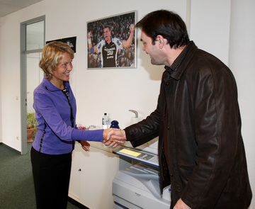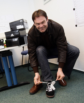 | Der richtige Schuh muss auch ausgewählt werden. | Uwe Schwenker un Bruno Martini. | Bruno Martini in der THW-Geschäftsstelle. | Bruno Martini wird von Thierry Omeyer in Melsdorf begrüßt. | |||