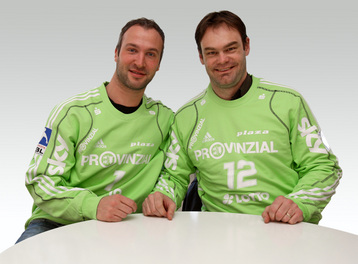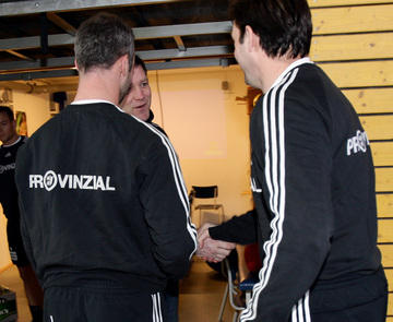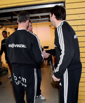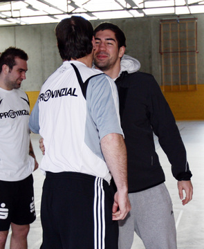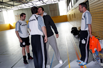 | Bruno Martini wird von Thierry Omeyer in Melsdorf begrüßt. | Alfred Gislason begrüßt Bruno Martini zum ersten Training. | Alfred Gislason begrüßt Bruno Martini zum ersten Training. | Stefan Lövgren begrüßt Bruno Martini zum ersten Training. | |||