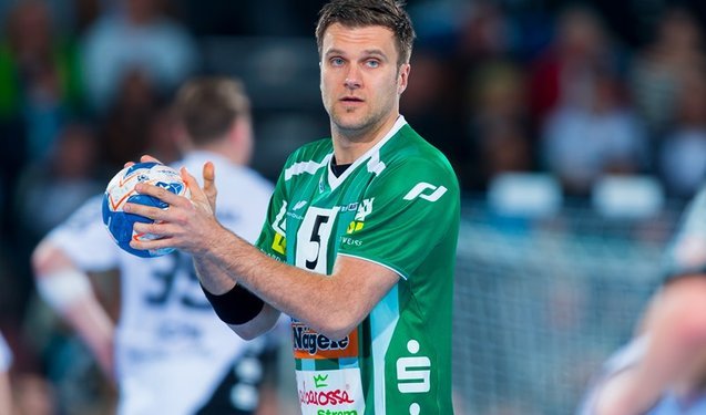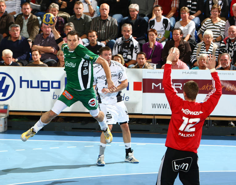 Frode Hagen überspringt die Göppinger Abwehr mit Dragos Oprea.