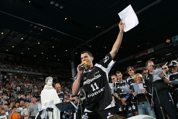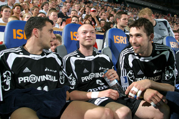 Deutscher Meister 2006! Adrian Wagner wird verabschiedet. Abschiedszeit. Adrian Wagner liegt verletzt am Boden, Physiotherapeut Uwe Brandenburg (mitte) und Mannschaftsarzt Dr. Detlev Brandecker (rechts) kümmern sich um den Linksaußen. Adrian Wagner, links Marcus Ahlm.