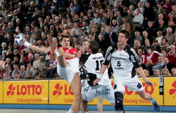 Markus Gaugisch setzt sich kraftvoll gegen Adrian Wagner durch, rechts Martin Boquist. Adrian Wagner fliegt zum Torwurf heran. Kiels Adrian Wagner zieht ab. Im Hintergrund von links Jörg Kunze, Ulrich Wolf und Frode Hagen. Adrian Wagner.