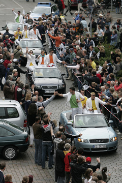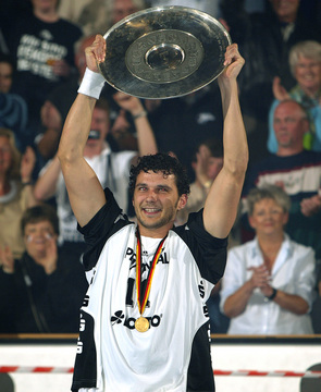 Der verletzte Adrian Wagner tritt zu seinem letzten Strafwurf in der Ostseehalle an. Deutscher Meister 2006! Adrian Wagner. Deutscher Meister 2006! Adrian Wagner. Deutscher Meister 2006! Autokorso zum Rathaus.