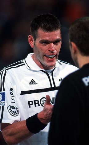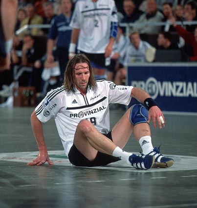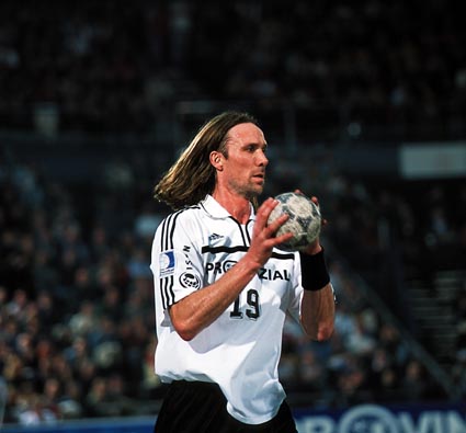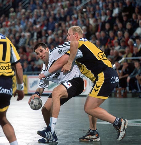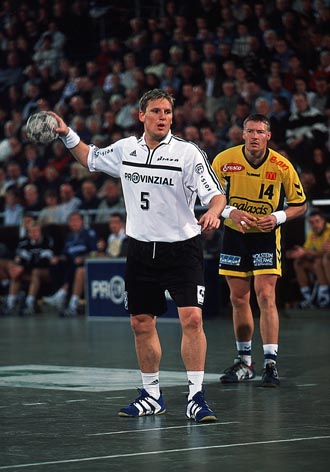 Staffan Olsson. Staffan gegen die Schwartauer Abwehr. Staffan setzt sich durch. Eine kleine Ruhepause für den "alten Schweden"...