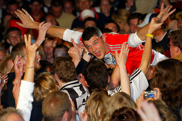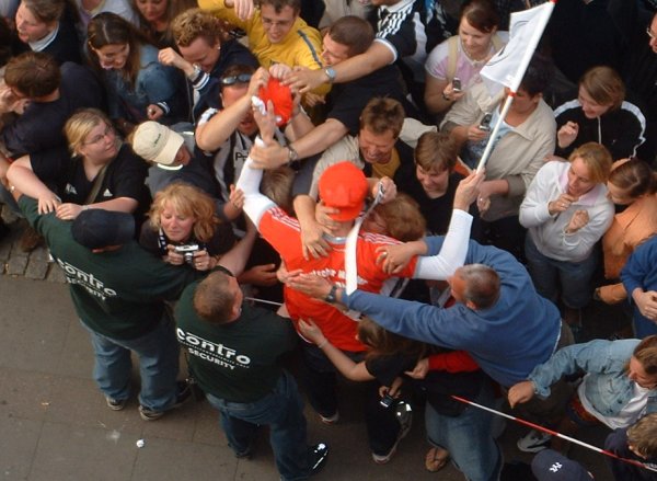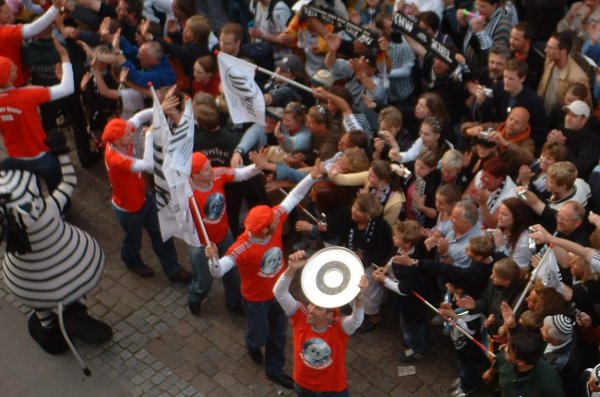 | Meisterfeier auf dem Kieler Rathausplatz: Adrian Wagner nimmt ein Bad in der Menge und lässt sich auf Händen tragen. | Meisterfeier auf dem Kieler Rathausplatz: Marcus Ahlm und Martin Boquist schreien ihre Freude lauthals heraus. | Meisterfeier auf dem Kieler Rathausplatz: Johan Pettersson schreit seine Freude laut heraus. | 20000 Fans feierten auf dem Kieler Rathausplatz. | |||