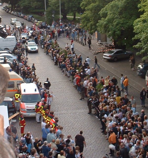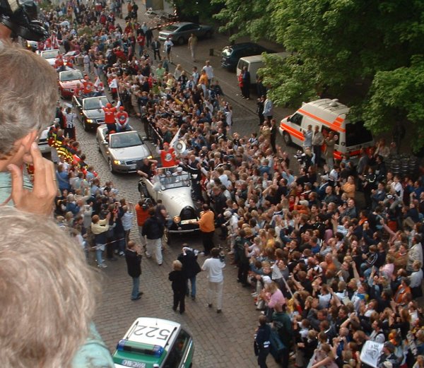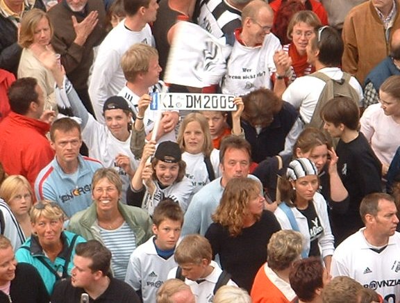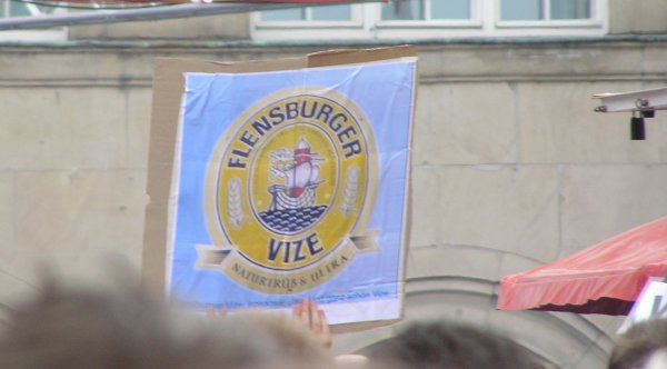 | Ein Gruß nach Flensburg. | Jubel auf dem Rathausplatz nach dem Sieg in Düsseldorf. | |||||
