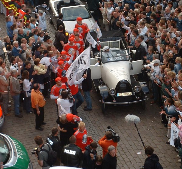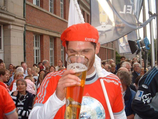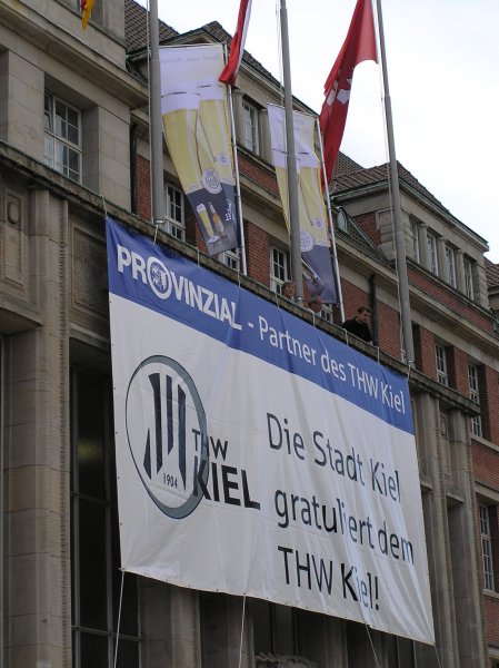 | THW-Kapitän Stefan Lövgren präsentiert den Fans die Meisterschale schon auf dem Flughafen Holtenau aus dem Cockpit-Dach heraus. | THW-Kapitän Stefan Lövgren präsentiert den Fans die Meisterschale schon auf dem Flughafen Holtenau aus dem Cockpit-Dach heraus. | Der THW Kiel ist Deutscher Handball-Meister 2005! Die Mannschaft feiert auf dem Rathaus-Balkon mit über 20000 Fans davor. | Der THW Kiel ist Deutscher Handball-Meister 2005! Die Mannschaft feiert auf dem Rathaus-Balkon mit über 20000 Fans davor. | |||