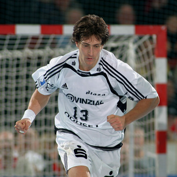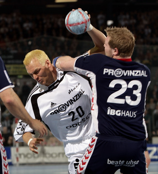 | Flensburgs Joachim Boldsen kommt am Kreis frei zum Torwurf. Links Stefan Lövgren, rechts Marcus Ahlm. | Torge Johannsen im Sprungwurf. | Blazenko Lackovic am Ball. | THW-Torwart Mattias Andersson reißt jubelnd beide Arme in die Höhe. | |||