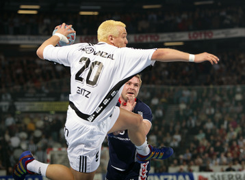 | Kapitän Stefan Lövgren während einer Auszeit. | Adrian Wagner greift sich nach einem Foul an den Hals. | Norwegische Freunde: Glenn Solberg, Frode Hagen und Johnny Jensen. | SG-Kapitän Sören Stryger am Ball. | |||