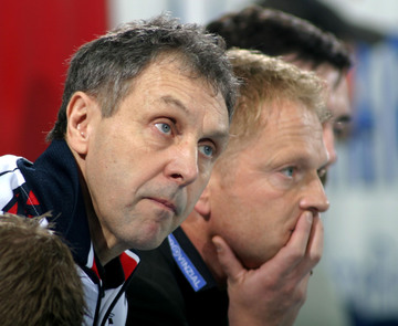 | SG-Geschäftsführer Thorsten Storm sitzt mit nachdenklicher Miene auf der Bank, während im Hintergrund Flensburgs Trainer Kent-Harry Andersson mit Andrej Klimovets spricht. | THW-Torwart Mattias Andersson kniet vor seinem Tor. | SG-Torwart Jan Holpert kniet vor seinem Tor. | Marcus Ahlm ballt im Zurücklaufen die Faust. | |||