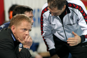 | Christian Zeitz wird von Joachim Boldsen attackiert. | Christian Zeitz setzt zum Torwurf an, im Hintergrund Joachim Boldsen. | Christian Zeitz im Gespräch mit Flensburgs Torwart Jan Holpert. | Flensburgs Trainer Kent-Harry Andersson und SG-Geschäftsführer Thorsten Storm sitzen nebeneinander auf der Bank. | |||