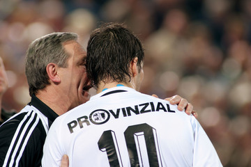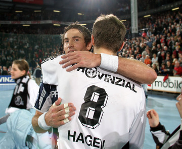 | Kiels Kapitän Stefan Lövgren am Ball. | THW-Trainer Noka Serdarusic spricht seinem Kapitän Stefan Lövgren an der Seitenlinie Anweisungen ins Ohr. | Nach dem Spiel umarmen sich die beiden norwegischen Freunde Glenn Solberg und Frode Hagen. | Die beiden Kontrahenten THW Kiel und SG Flensburg-Handewitt begrüßen sich vor dem Anpfiff freundschaftlich. | |||