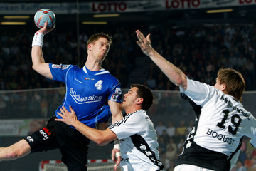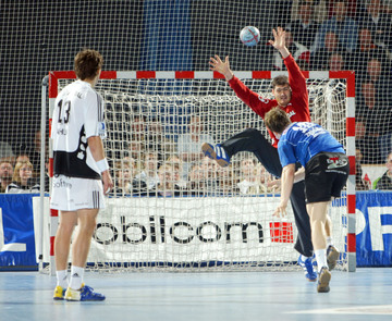 Pfullingens Alexandar Stevic hat sich gegen Martin Boquist durchgesetzt und zieht ab. Martin Boquist setzt sich gegen Axel Kromer in Szene. Adrian Wagner fliegt zum Torwurf heran. THW-Torwart Henning Fritz im Siebenmeter-Duell gegen Björn Navarin. Links Marcus Ahlm.