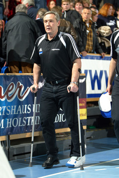 Wallaus Markus Roßmeier überspringt Abwehrspieler Klaus-Dieter Petersen. THW-Trainer Noka Serdarusic läuft nach seinem Archillessehnen-Abriss an Gehhilfen durch die Ostseehalle. THW-Linksaußen Henrik Lundström im Sprungwurf, rechts Wallaus Torhüter Zoran Djordjic. THW-Torhüter Henning Fritz präsentiert die Trophäe zur Wahl zum "Welthandballer des Jahres 2004".