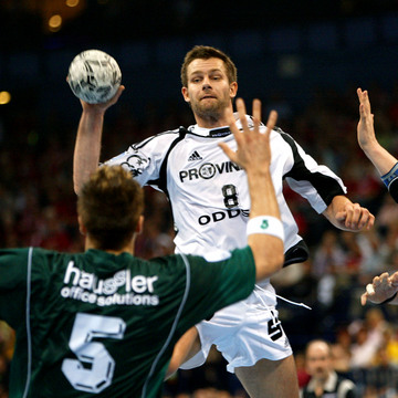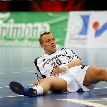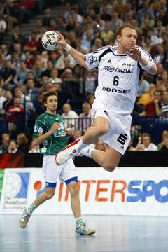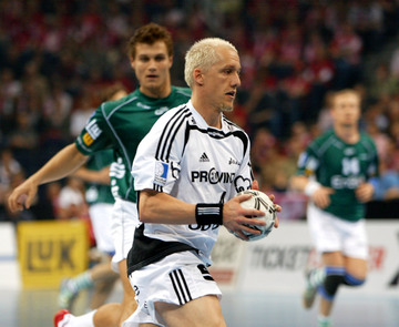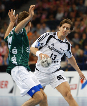 Christian Zeitz sitzt enttäuscht auf dem Boden. Frode Hagen überspringt die Göppinger Abwehr mit Dragos Oprea. 2. Halbfinale: Flensburg gegen Nordhorn: Flensburgs Blazenko Lackovic wird von Holger Glandorf gestoppt. Rechts klammert Iwan Ursic Flensburgs Kreisläufer Johnny Jensen. 2. Halbfinale: Flensburg gegen Nordhorn: Nordhorns Piotr Przybecki.