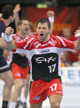 2. Halbfinale: Peter Gentzel hielt bei Nordhorn überragend. 2. Halbfinale: Nordhorns Ljubomir Vranjes jubelt und reckt die Fäuste in die Höhe. 2. Halbfinale: Flensburger Jubel nach dem Schlussspfiff. Von links: Lars Christiansen, Andrej Klimovets, Blazenko Lackovic, Joachim Boldsen und Dan Beutler.