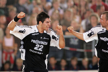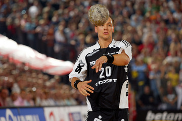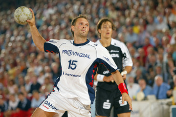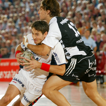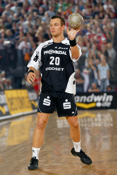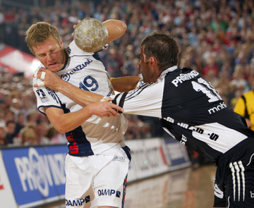 | Flensburgs Kreisläufer Michael Knudsen setzt zum Torwurf an, Stefan Lövgren (links) hat ihn verpasst. | Nikola Karabatic ballt die Faust und schreit seine Freude über einen seiner Treffer hinaus. | Nikola Karabatic ballt die Faust und schreit seine Freude über einen seiner Treffer hinaus. rechts Vid Kavticnik. | Stefan Lövgren setzt zum Torwurf an und wird dabei von den Flensburger Abwehrspielern Glenn Solberg (links) und Johnny Jensen (verdeckt) attackiert. | |||