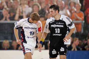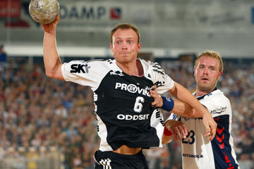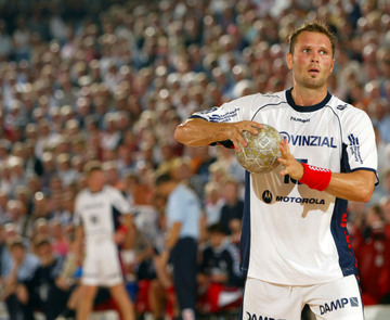 | Stefan Lövgren. | THW-Torwart Henning Fritz springt einem Tempogegenstoß des Flensburgers Lars Christiansen entgegen. | Zwei norwegische Freunde als Gegner für 60 Minuten: Frode Hagen (links) im Zweikampf mit Flensburgs Glenn Solberg. | Frode Hagen. | |||
