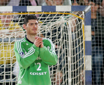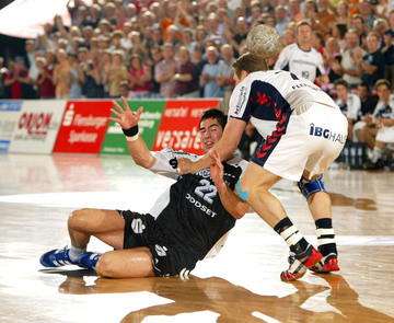 | Nikola Karabatic wird von Flensburgs Abwehrspieler Michael V. Knudsen attackiert und zu Fall gebracht. | Nikola Karabatic setzt zum Torwurf an und wird dabei von Flensburgs Joachim Boldsen gehalten. | Flensburgs Torhüter Jan Holpert ballt die Fäuste und schreit seine Freude heraus. | Christian Zeitz. | |||