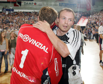 | Beten half auch nicht... Torwart Henning Fritz und sein THW Kiel verloren in Flensburg mit 33:39. | Gratulation unter alten Weggefährten: Flensburgs Torwart Dan Beutler (links) und Kiels Linksaußen Henrik Lundström (rechts) spielten in Schweden bei Redbergslids IK noch in einem Team. | |||||