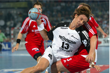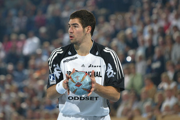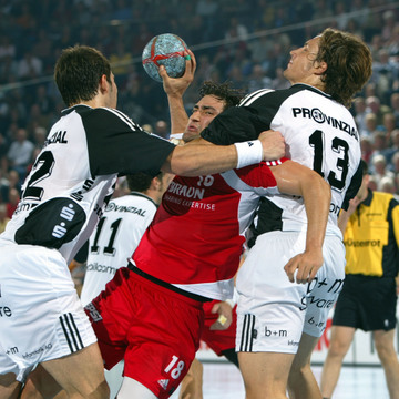 Viktor Szilagyi wird beim Wurf unfair von Melsungens Predrag Kontic gestoppt. Nikola Karabatic. Christian Zeitz wird von Grigorios Sanikis attackiert. Marcus Ahlm.
