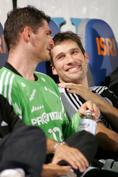 Noka Serdarusic (rechts) hält väterlich seinen Arm über Kiels Christian Zeitz. Die Kieler Auswechselbank. Marcus Ahlm setzt sich im Angriff gegen den Melsunger Markus Pregler durch. Nikola Karabatic.