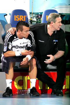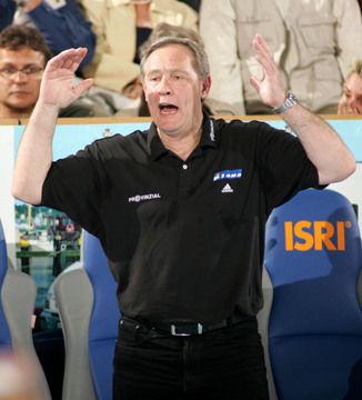 Henning Fritz (rechts) und Mattias Andersson beim gemeinsamen Dehnen in der Halbzeitpause. Stefan Lövgren unterhält sich auf der Bank lächelnd mit Henning Fritz. Grigorios Sanikis vom MT Melsungen wird von Nikola Karabatic (links) und Marcus Ahlm (rechts) in die Zange genommen. Trainer Noka Serdarusic steht gestikulierend am Spielfeldrand.