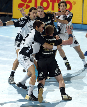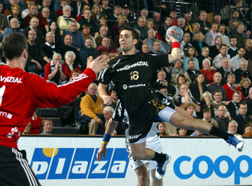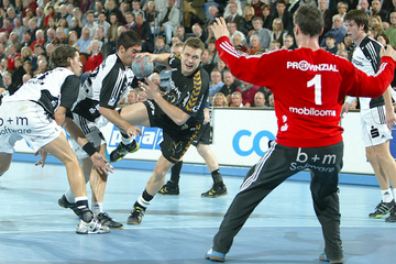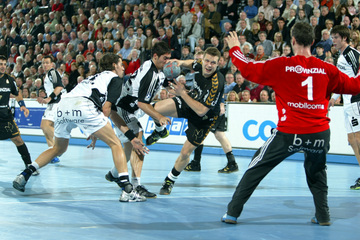 Stefan Lövgren steigt hoch. Dr. Mommsen, Boldsen, Beutler und Andersson. Karabatic gegen Lauritzen. Knudsen und Lijewski gegen Karabatic.
