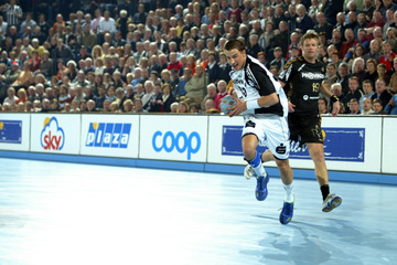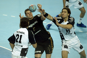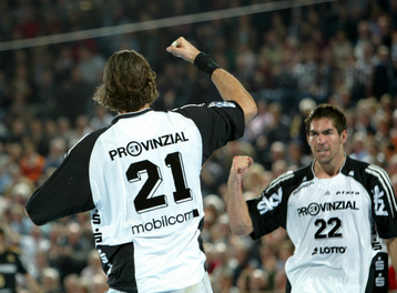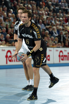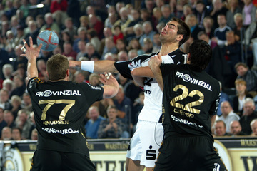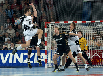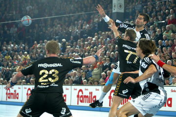 Jeppsen und Ahlm gegen Knudsen. Karatbatic passt. Lars Christiansen beim Strafwurf. Torge Johanssen gegen Thierry Omeyer.