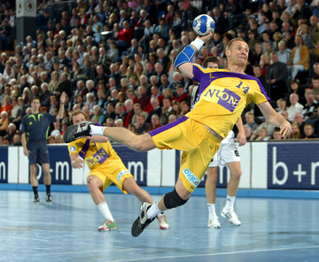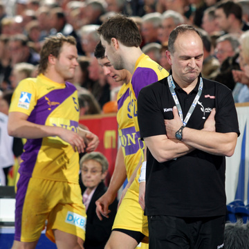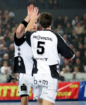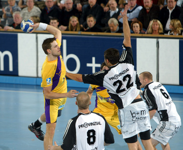 | Deckung! | Marcus Ahlm im Kampf um den Ball. | Viktor Szilagyi. | Füche-Coach Jörn-Uwe Lommel. | |||