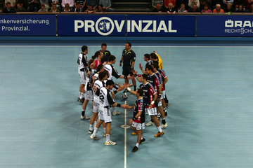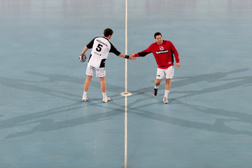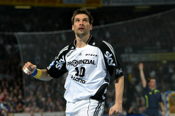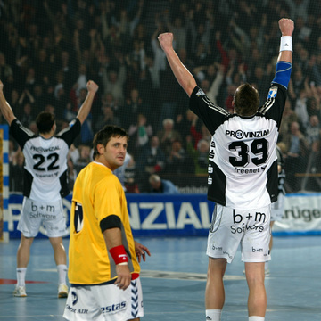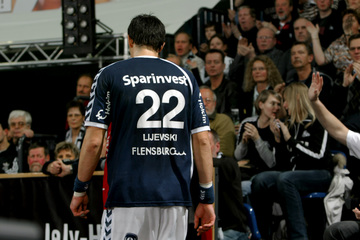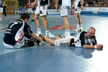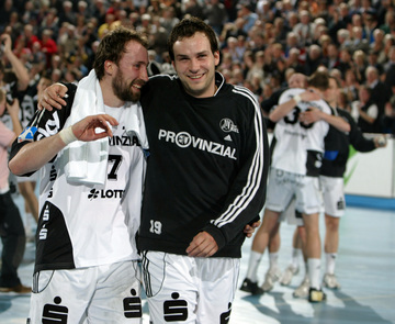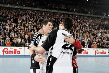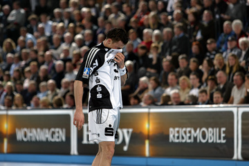 Marcin Lijewski verlässtg nach seine dritten Zeitstrafe das Feld. Marcus Ahlm. Vid Kavticnik. Kieler Jubel nach dem Sieg.
