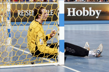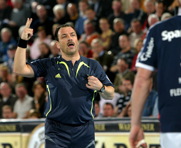 Henrik Lundström. Siebenmeter. Marcin Lijewski muss nach der dritten Zeitstrafe die Halle verlassen. Stefan Lövgren schaut auf den Spielstand.