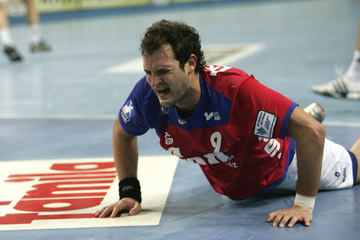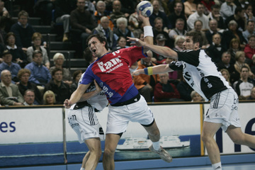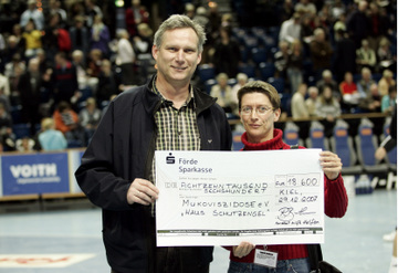 Kim Andersson. Jens Tiedtke. Andreas Kunz wird von Stefan Lövgren behindert. Renate Butler (rechts) von Handball hilft Helfen übergibt einen Scheck in Höhe von 18.600 Euro an die Mukoviszidose-Hilfe.