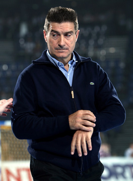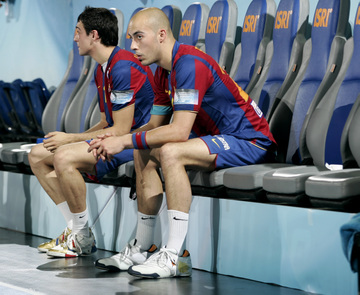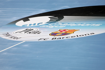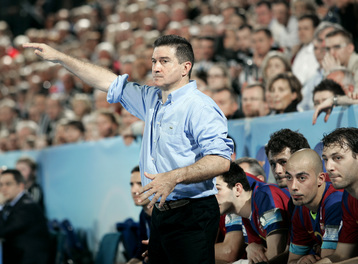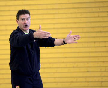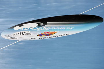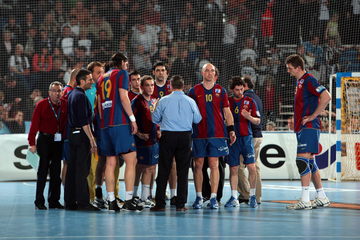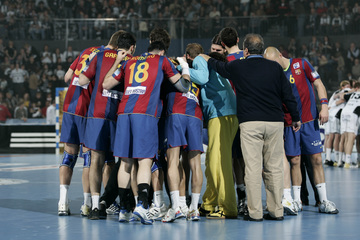 Laszlo Nagy und Vid Kavticnik. Laszlo Nagy und Vid Kavticnik. Barcelonas Trainer Manuel Cadenas. Das Spiellogo.