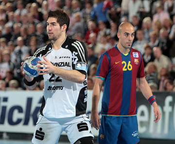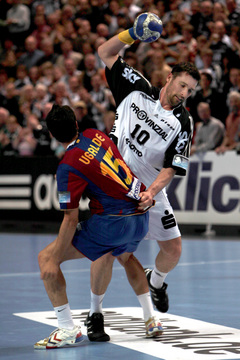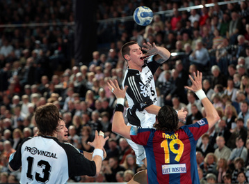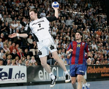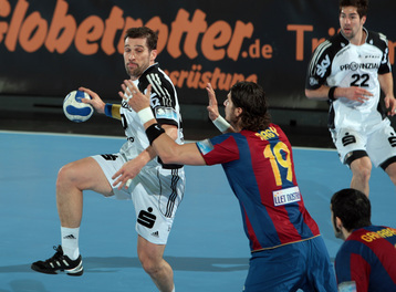 Zurück in Kiel. Der Pass. Filip Jicha wirft mit ungeheurer Gewalt. Nikola Karabatic vor Barcas Abwehr.
