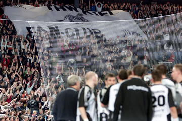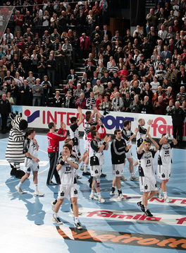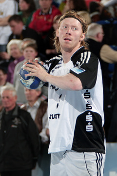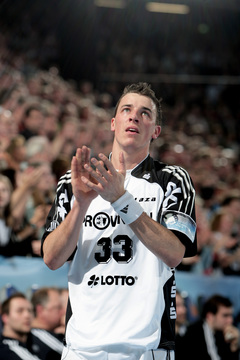 | Die Fans wünschen Uwe Schwenker gute Besserung. | Nikola Karabatic. | Marcus Ahlm. | Anwurf. | |||