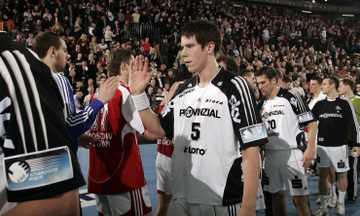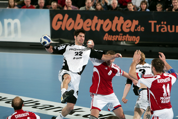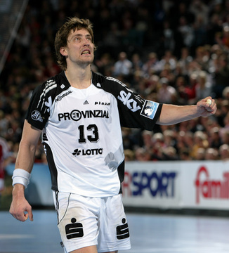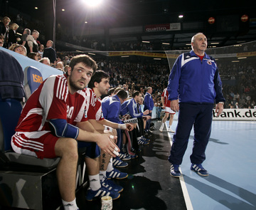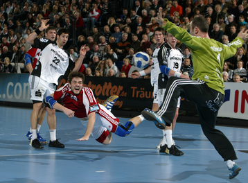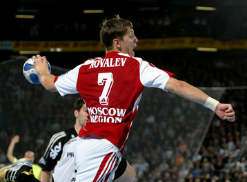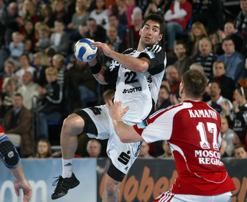 Omeyer und Serdarusic. Moskaus Trainer Vladimir Maximov. Dominik Klein wird attackiert. Nikola Karabatic greift an.