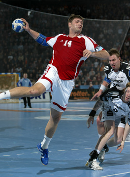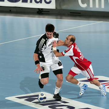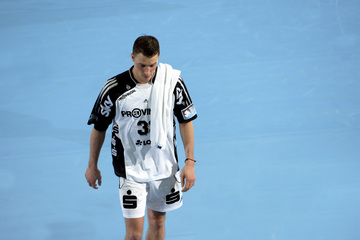 Nikola Karabatic greift an. Nikola Karabatic wird attackiert. Anwurf. Vor dem Anwurf.