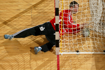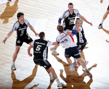 Kim Andersson attackiert Alen Muratovic. Vor dem Spiel. Nikola Karabatic. Johnny Jensen  und Filip Jicha.