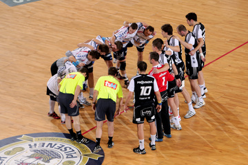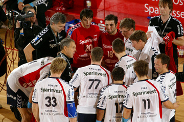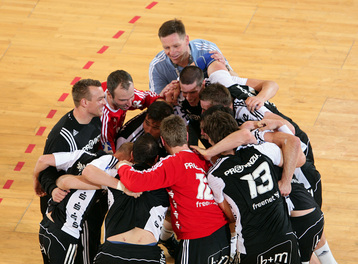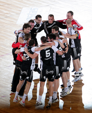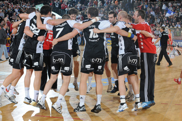 Jubel nach dem Sieg. Auszeit. Nikola Karabatic und Stefan Lövgren. Alen Muratovic.
